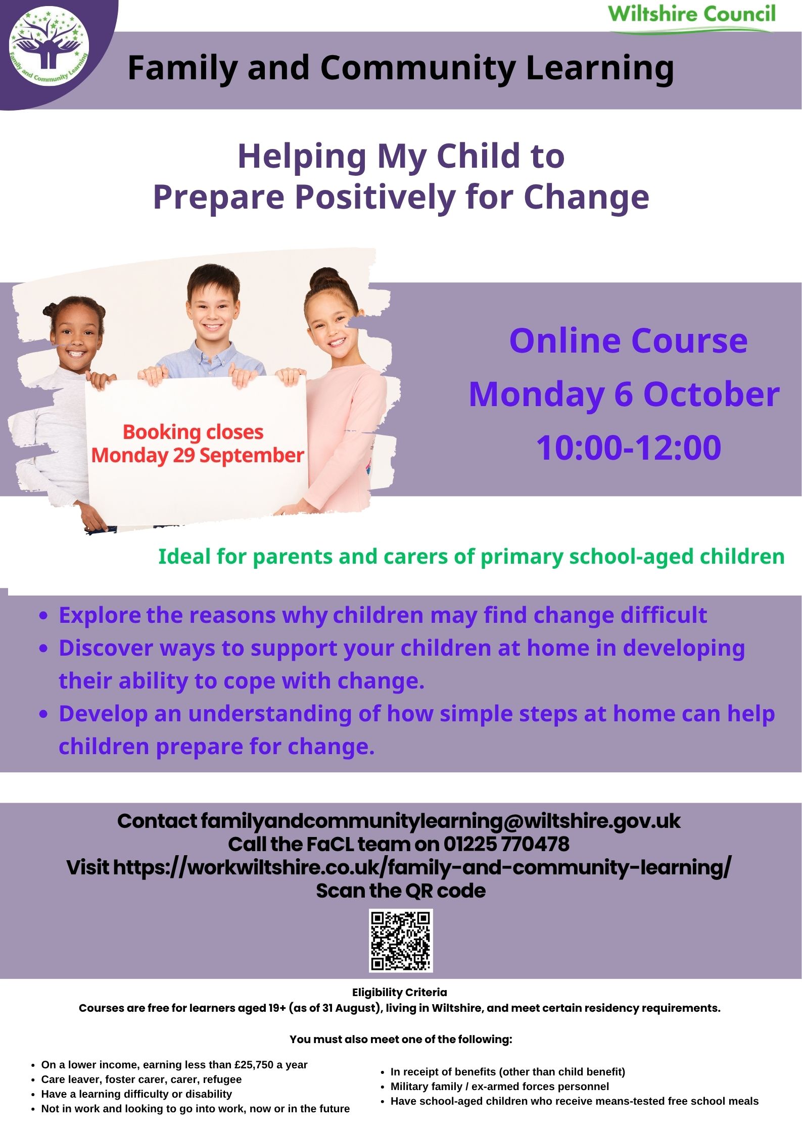 Contact familyandcommunitylearning@wiltshire.gov.uk Call the FaCL team on 01225 770478 Visit https://workwiltshire.co.uk/family-and-community-learning/ Scan the QR code