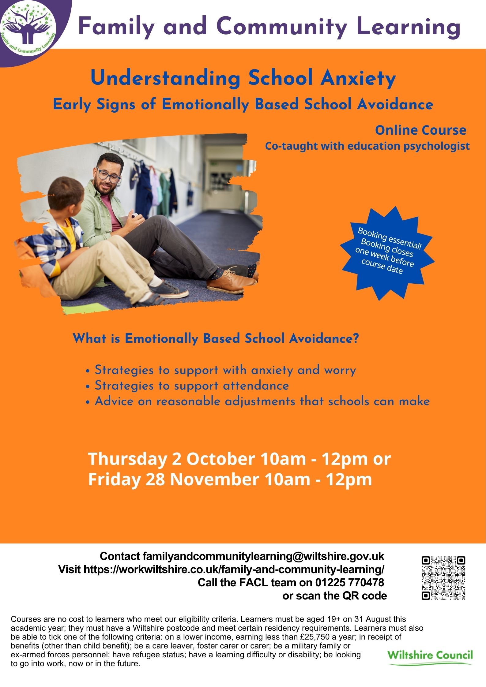 Wiltshire Council Family and Community Learning Online Course Helping My Child with Anxiety and Worry Ideal for parents and carers of primary school-aged children Tuesday 4 November 10:00-12:00 Booking Closes […]